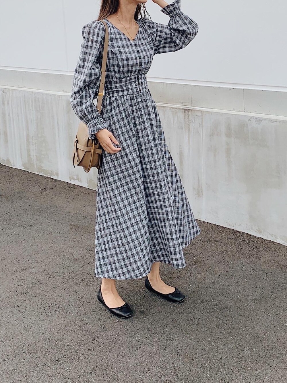 ブラック系のワンピースを着用したレディースの秋コーディネートの1枚目の写真