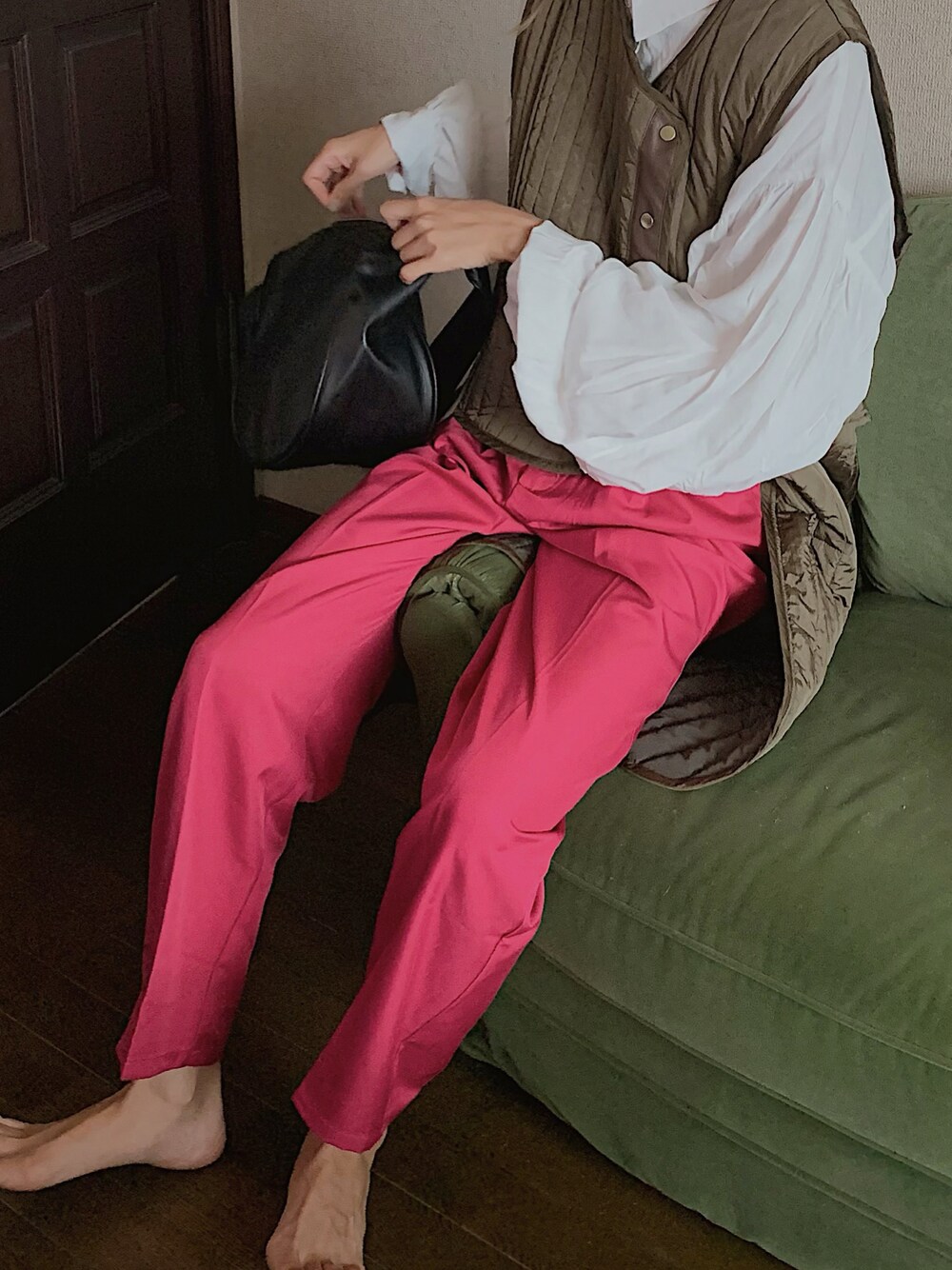 ピンク系のスラックスを着用したレディースの秋コーディネートの1枚目の写真