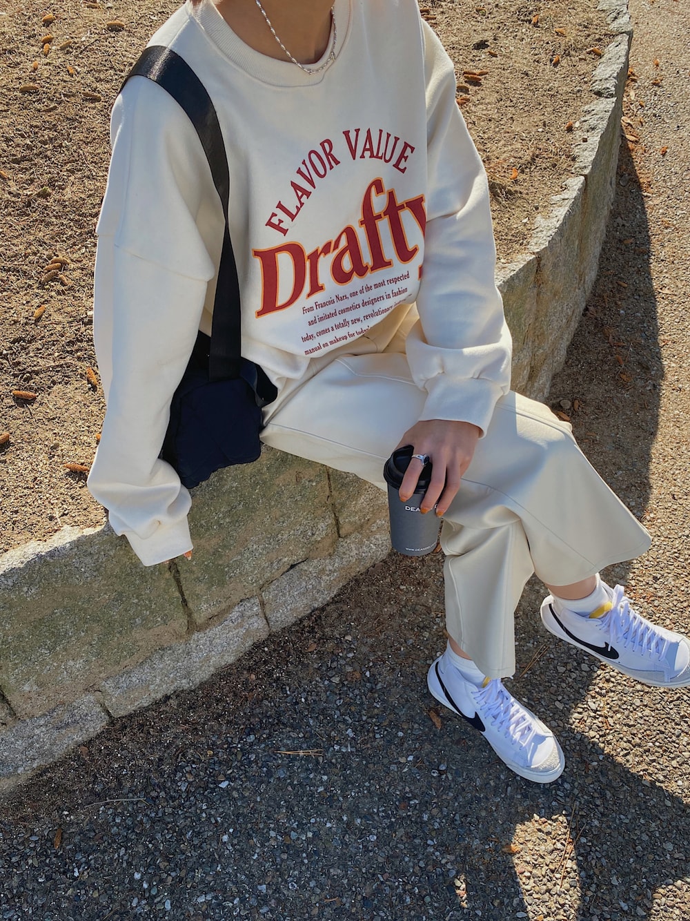 ホワイト系のトップスを着用したレディースの冬コーディネートの1枚目の写真