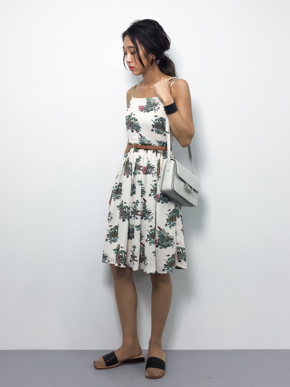 ◎おとなカジュアルワンピースコーデ◎ ワンピースはとても可愛い柄×バッグと足元で大人っぽさを出すコーデ