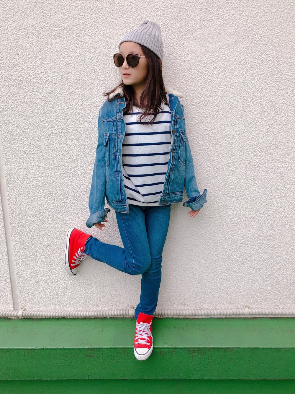 おはようございます☀️ 本日学校コーデ☆彡.。 赤コンはNBに替えて。 デニデニにボーダーに赤コン♡ 定番♡♡♡ しまむらのニット帽。 まだかぶれます✨ デニジャケはOLD NAVY のレディースSS着てます♡ ブランシェスのデニム裏起毛でこのスキニー感♡ 毎年愛用しています♡ size140 見に来ていただきありがとうございます♡♡♡♡♡