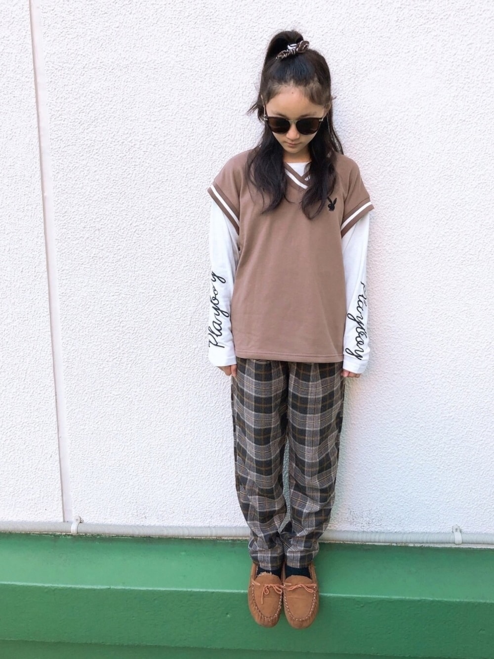こんにちは。 今日の学校コーデ✩.*˚ PLAY BOYのベストとロンT^_^ くっついてます😄 しまむらレディースです♡ チェックパンツまだまだブカブカ~ 見に来ていただきありがとうございます。