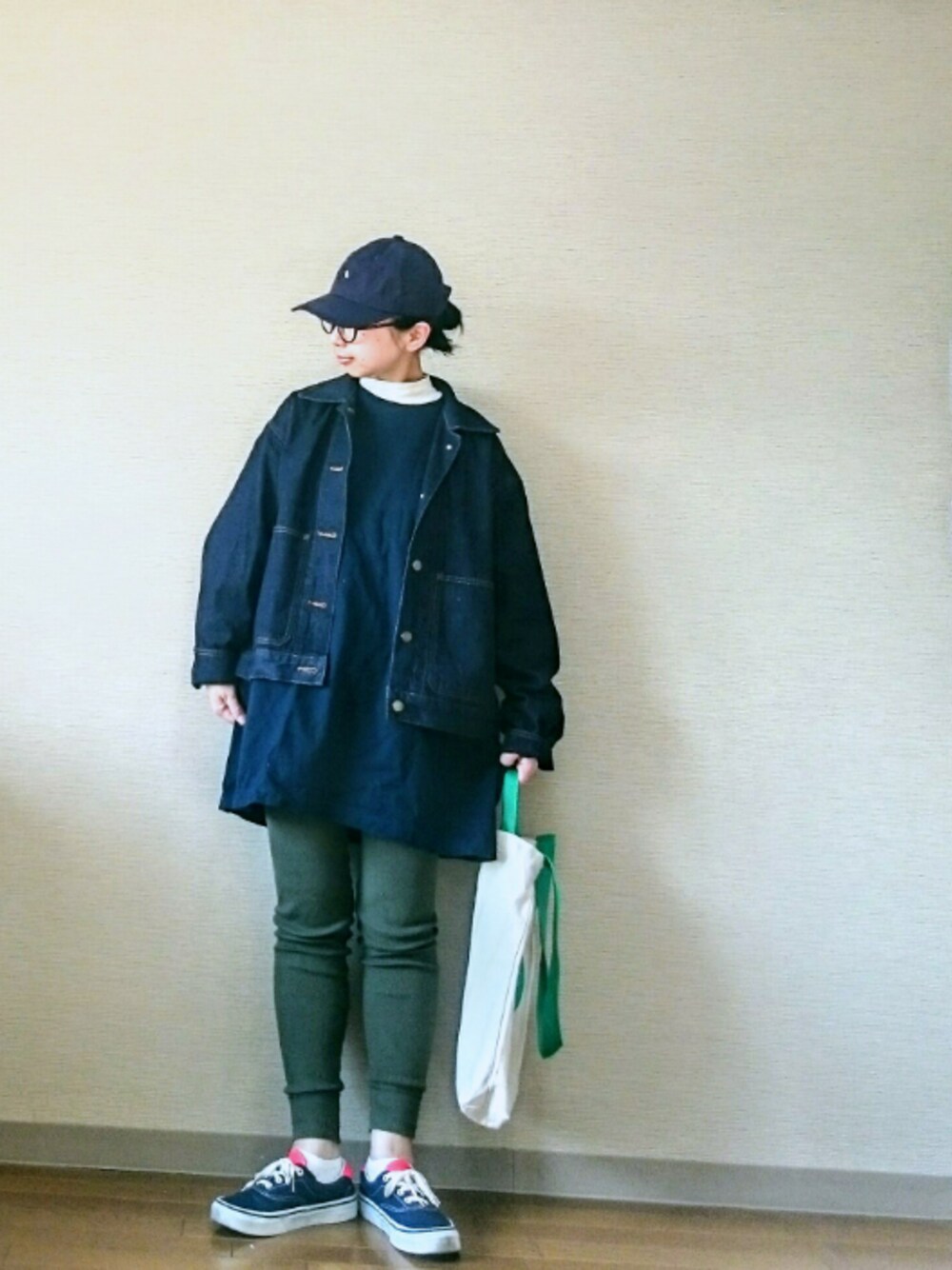 おはようございます☺ ネイビーとグリーン系とキナリ ユニクロU のデニムジャケットはやっぱ形カワイイです🙆