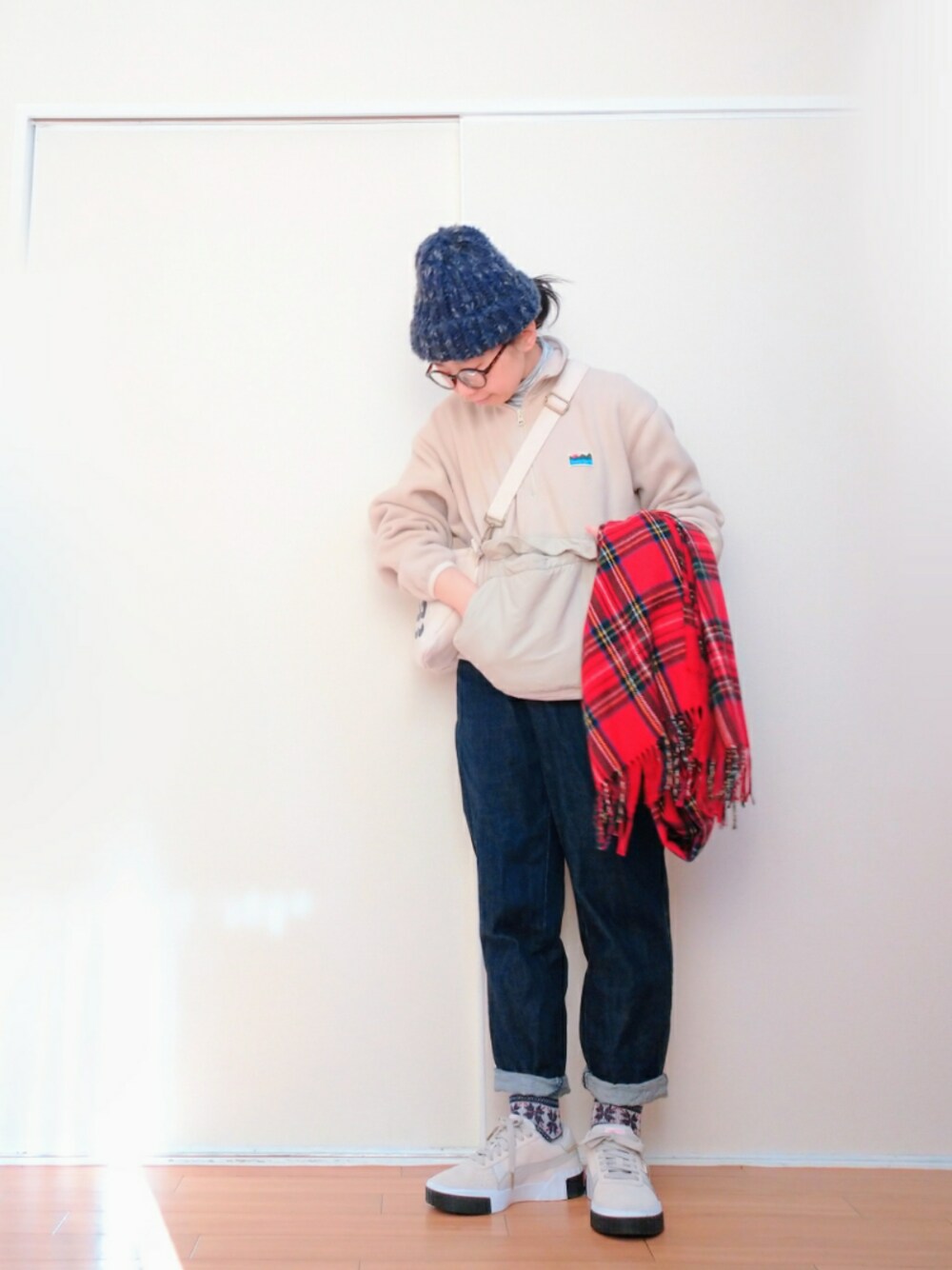 はらのニットキャップ/ビーニー「ファーポンポンニットワッチ」を使ったコーディネート