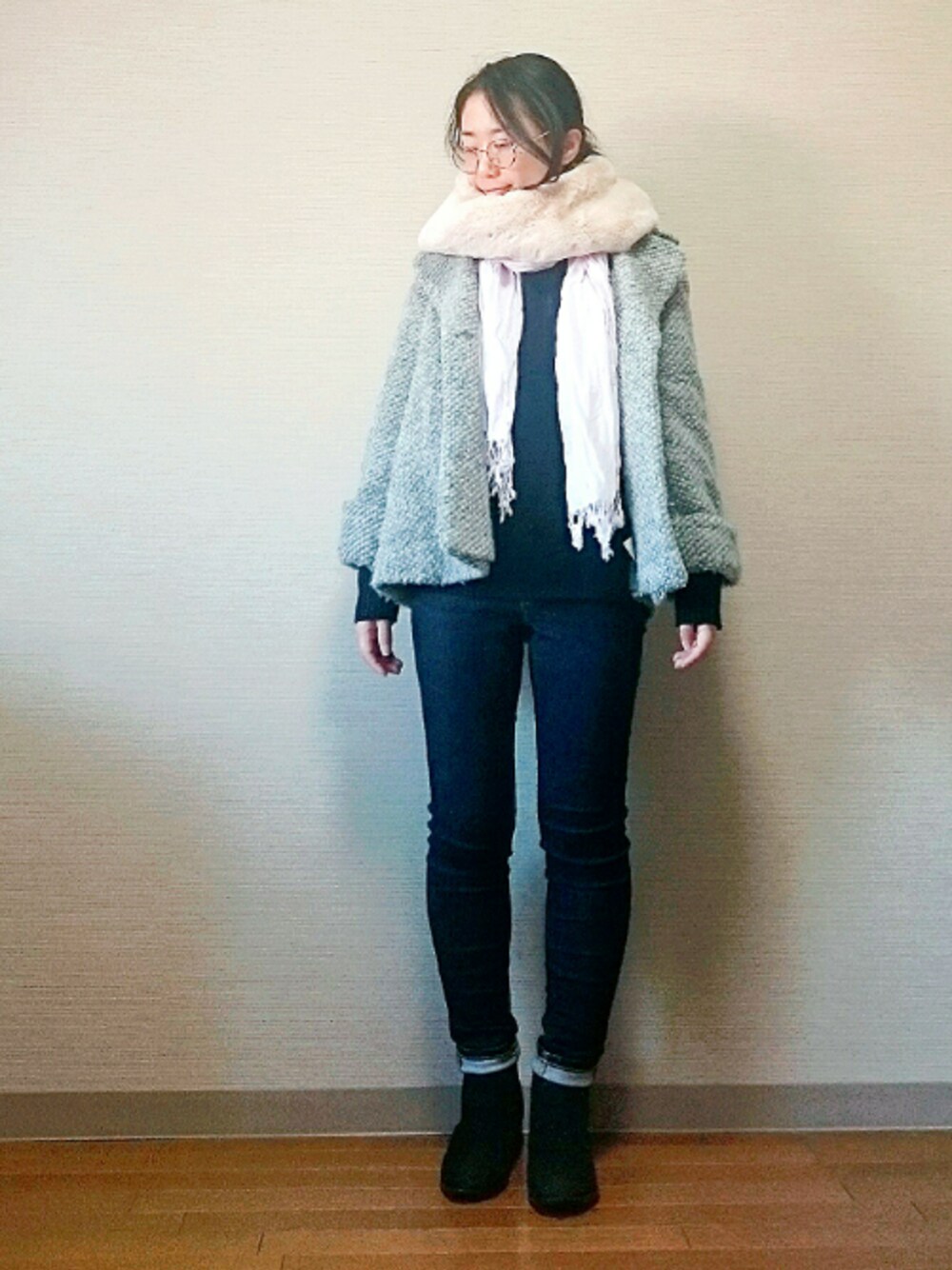 今晩は🌃 今日は、お日さん☀出てるのに、雪も舞ってるという変わったお天気でした。 本日は、さぶすぎて❄ストール1枚じゃ無理です😵コーデでした🙆 ジーンズが パツパツなのは 下にタイツ はいてるからや と思いたひ。。