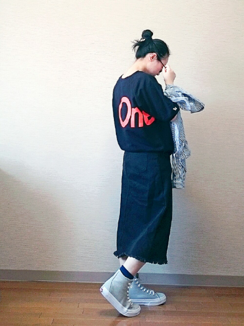 おはようございます☀ 昨日は暑すぎたので、半袖解禁しました🙆 coenさんとこのスウェットは背中から脇のプリントが カワイイので、後ろ向けで失礼あそばせです🙈 上下黒っぽいので、日除けのシャツとスニーカーは、 薄色で🙆