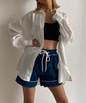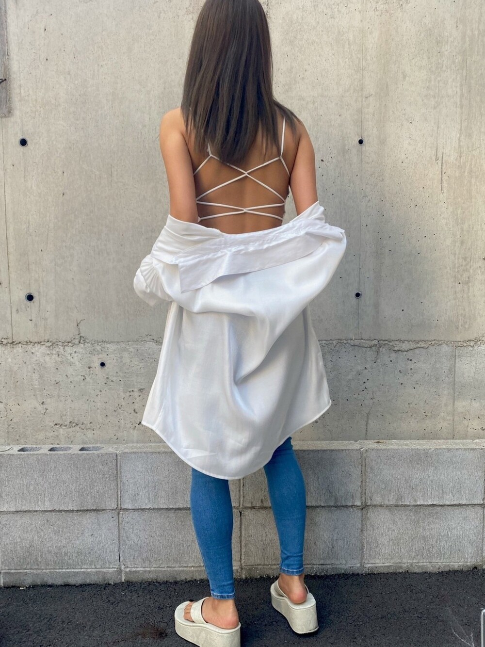 バックがかわいいバッククロスキャミ🤍 背中空きの洋服にも、シャツを羽織ってチラ見せもかわいいです! オーロラシャツは光の加減で色味が変わるので、高見え✨