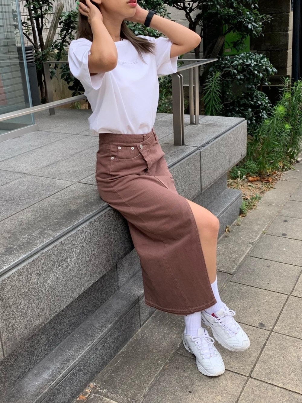 深いスリットが入ったスカートとロゴTシャツ❤️🔥 スカートはタイトめなのでキレイめにも着こなせますが、あえてソックス×スニーカーでカジュアルスポーティーにしました✊🏾