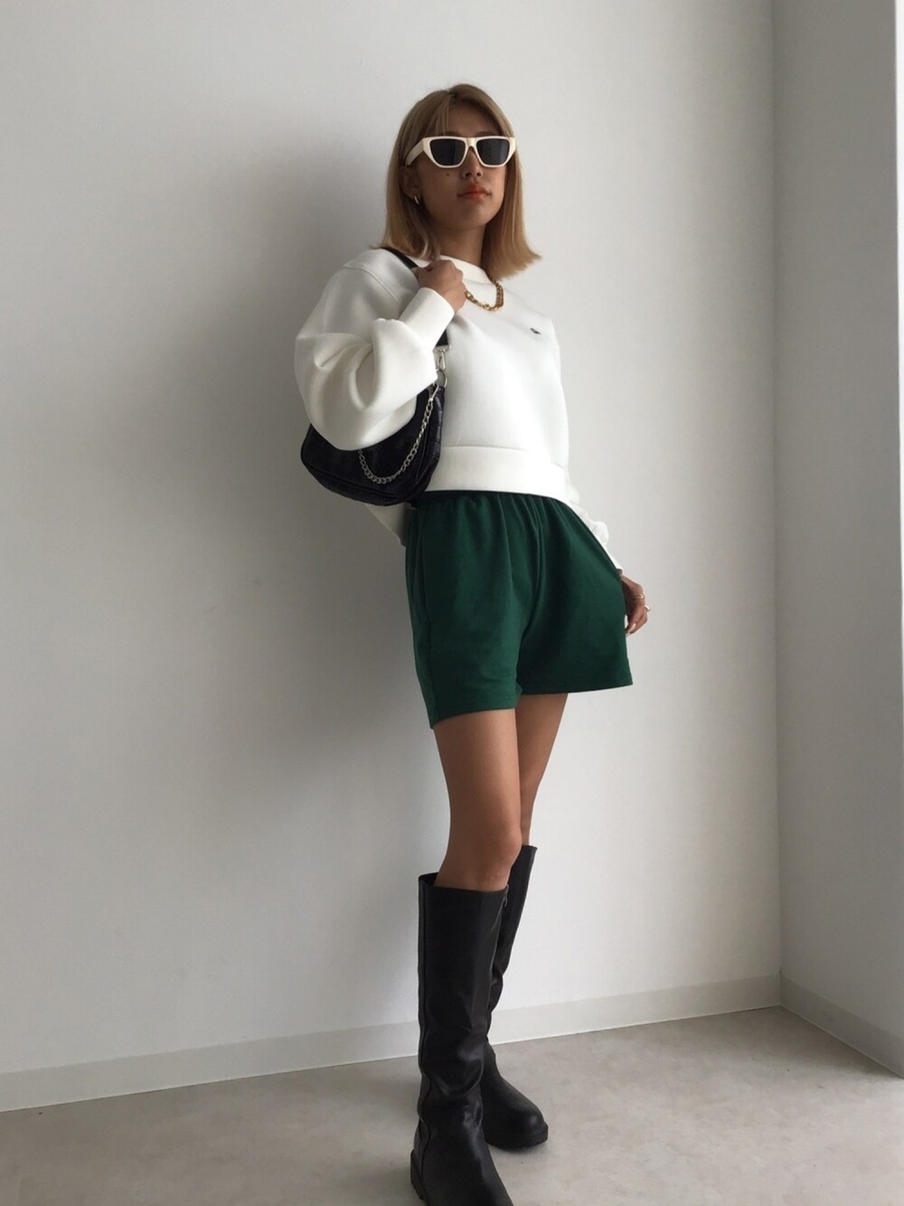 ボンディングプルオーバーのホワイトカラーは刺繍がグリーンなので、ボトムスをグリーンで合わせました✊🏾 同生地のスウェットパンツとのセットアップコーデもおすすめです🤍