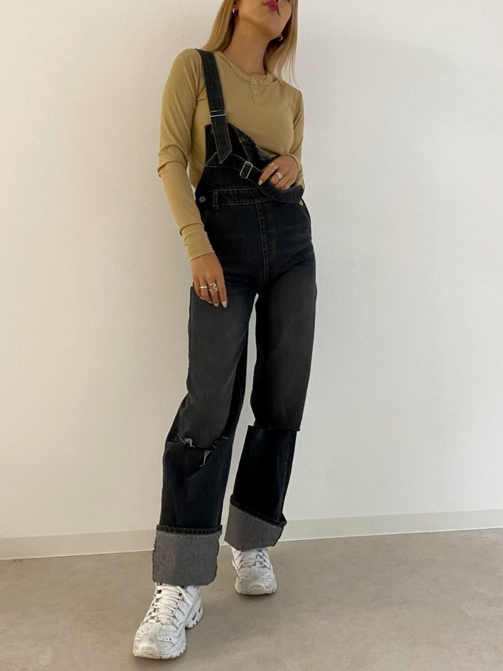 秋の新作コーデ🧡 デコルテラインにカットアウトデザインが入ったヘンリーネックTとカジュアルすぎないサロペット✌🏾