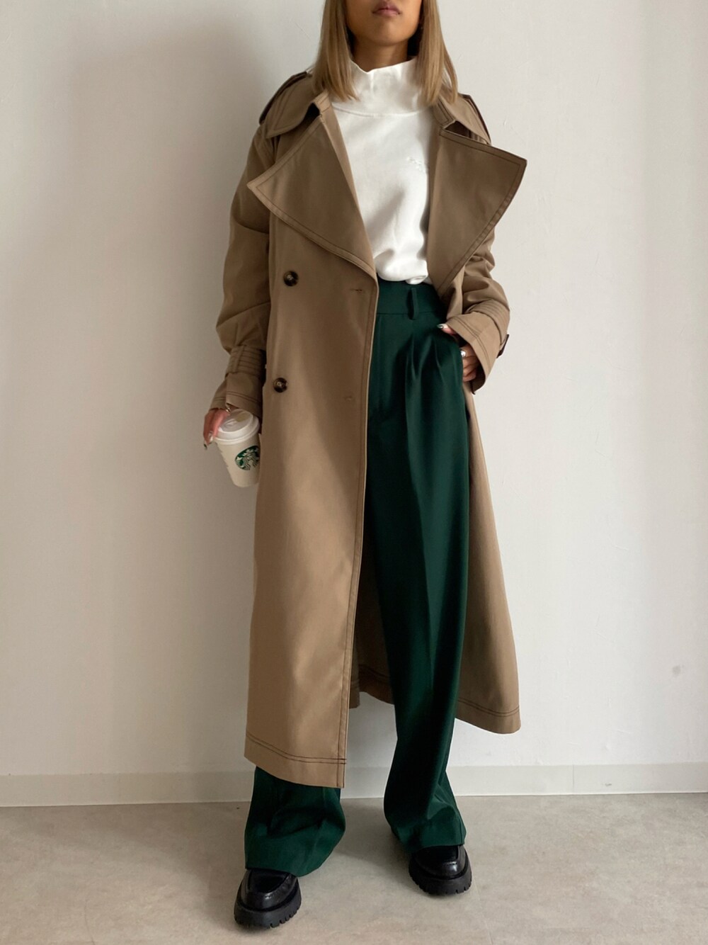 着回しのきくオーバーサイズのトレンチコート🧥 グリーンパンツと合わせてトレンドコーデに💚