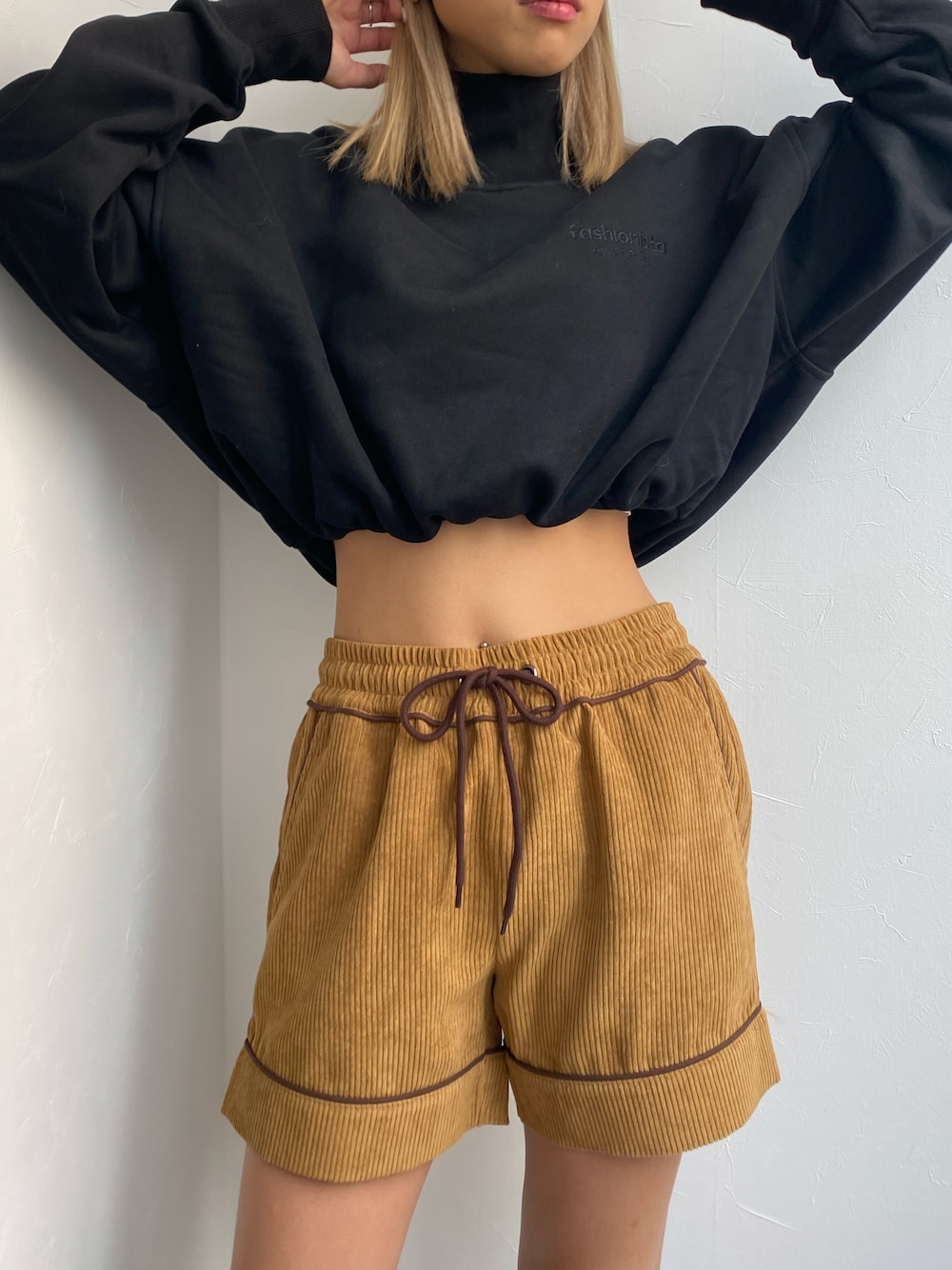 裾が折り返しデザインがかわいいトップス🖤 ショート丈でも裏起毛になっていて、この冬大活躍アイテム! ボトムスはセットアップ着用でも別々でも着回しのきくコーデュロイショートパンツ!