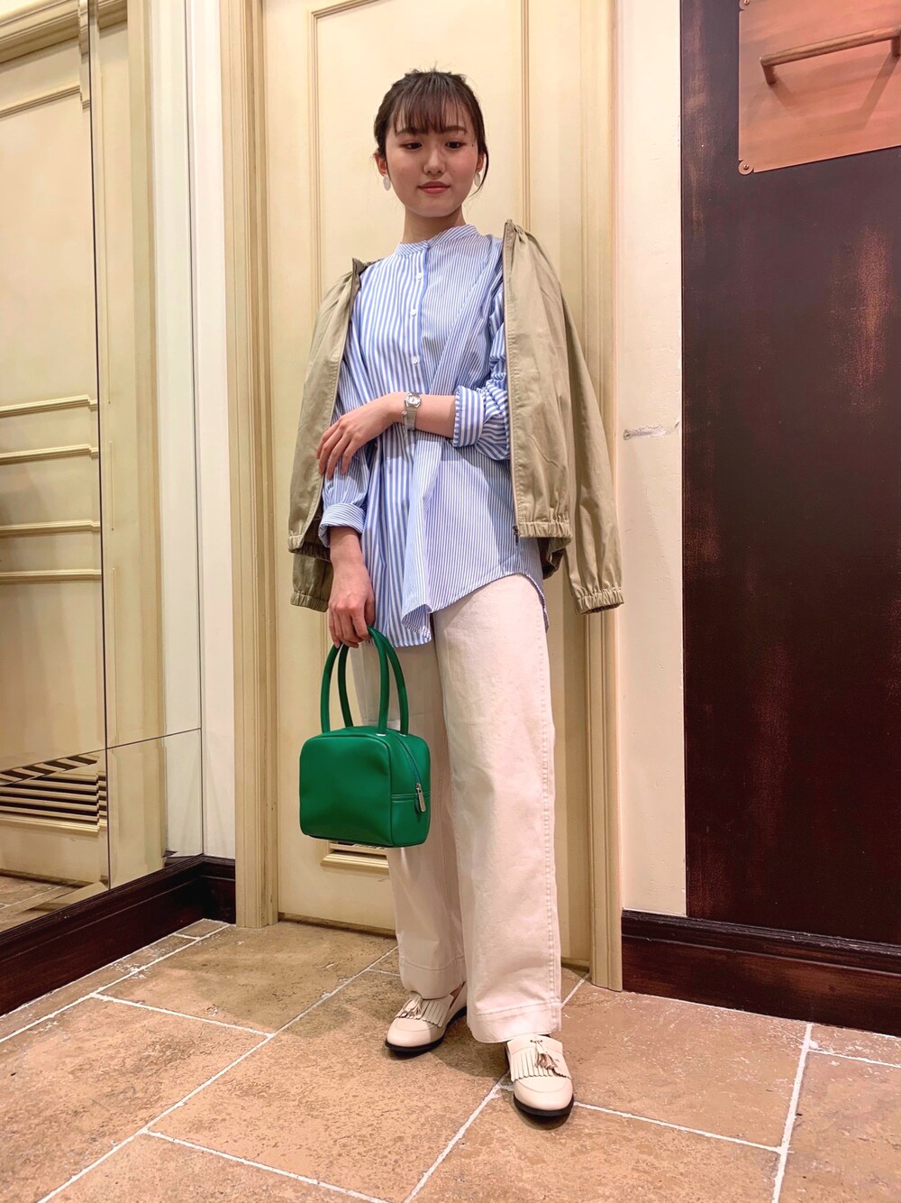 ご覧いただきましてありがとうございます☺︎︎︎︎ グリーンのバッグがアクセントになっているカジュアルスタイルです💚 春らしいベージュカラーでまとめたコーディネートにブルーのストライプシャツを合わせて爽やかさを演出してみました 御来店心よりお待ちしております✨