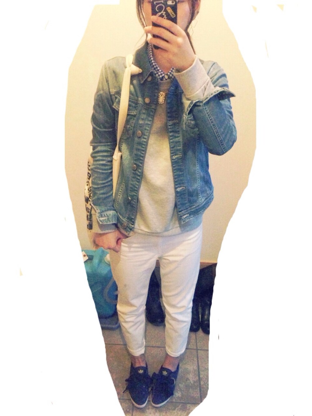 白デニムにスエット。 中はギンガムチェックシャツ。 靴はadidasのリボンスニーカー。 らくちん☻
