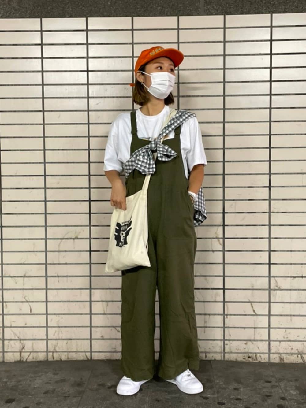 カーキのオーバーオールを着たかったので、キャップはオレンジで差し色に👏 流行りのたすき掛けも取り入れてみました❤️