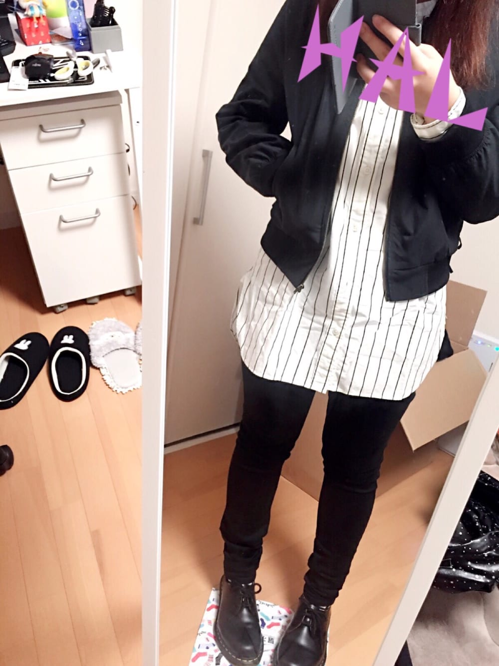 マーチンをやっと履けました☺️☺️ 素晴らしくいいですよねマーチン…かわいい… シャツどこのだったかな〜 襟がないタイプのやーつです 手が餅みたいだったので名前で隠してるけど隠しきれてないですね…😌😌😌 そして部屋の汚さが!!バレる!! 今日はおそ松さんですね〜〜夜更かしわ〜〜い🙌🙌