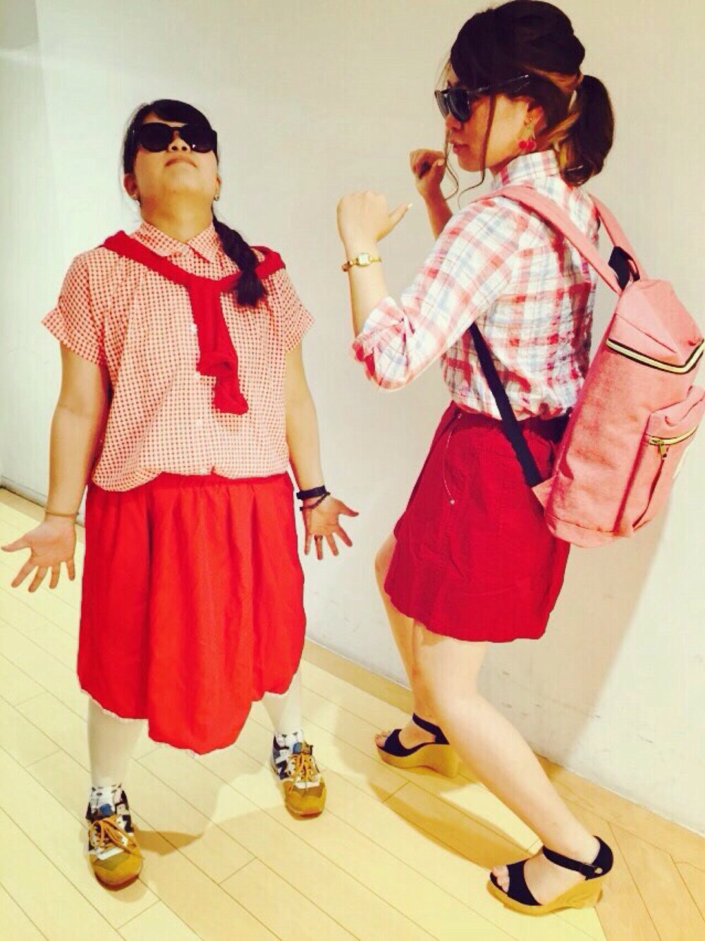 ◯ッスン◯レライPart2!! スタッフとポージングをチェンジして またまたやってみました☆ お客様の笑顔の為に身体を張って尽くす楽しいスタッフの雰囲気が伝わると嬉しいです(笑) さて左スタッフのボトムは実はリバーシブル 裏面は白ベースの細いストライプ仕様になっています、2度美味しい着回しの効く スカートは旅行にも便利ですよね◎ トップスのギンガムチェックシャツは ちょっぴり透け感のある見た目にも涼しい1枚 細かいチェックなので女の子らしく、 レモンイエローのキャミや白タンクと重ねて前開きで着ても爽やかで可愛いらしい 右スタッフの背負うリュックは実用的かつ お洒落なデザインが人気のアイテム♡ スクエアのフォルム+背中のクッションで 中の荷物が崩れません!軽くて丈夫です!! お仕事される方、荷物の多い学生さんどちらにも使いやすい大きさ(A4すっぽり余裕) そしてトップスのチェックシャツはふんわり 柔らかい色合いが珍しく取り入れやすい 春夏に着ても暑苦しくないシワ加工の生地感は 冷房対策・日焼け防止にもお勧めです シューズは以前にも掲載したオープントゥ サンダルの色違い、黒に見えますが紺色です スタッフの所持率も高いコチラは本当に 履き心地が良くて形がキレイなんです☆ スエードの様な生地は春はソックス、秋は タイツと合わせてもOK