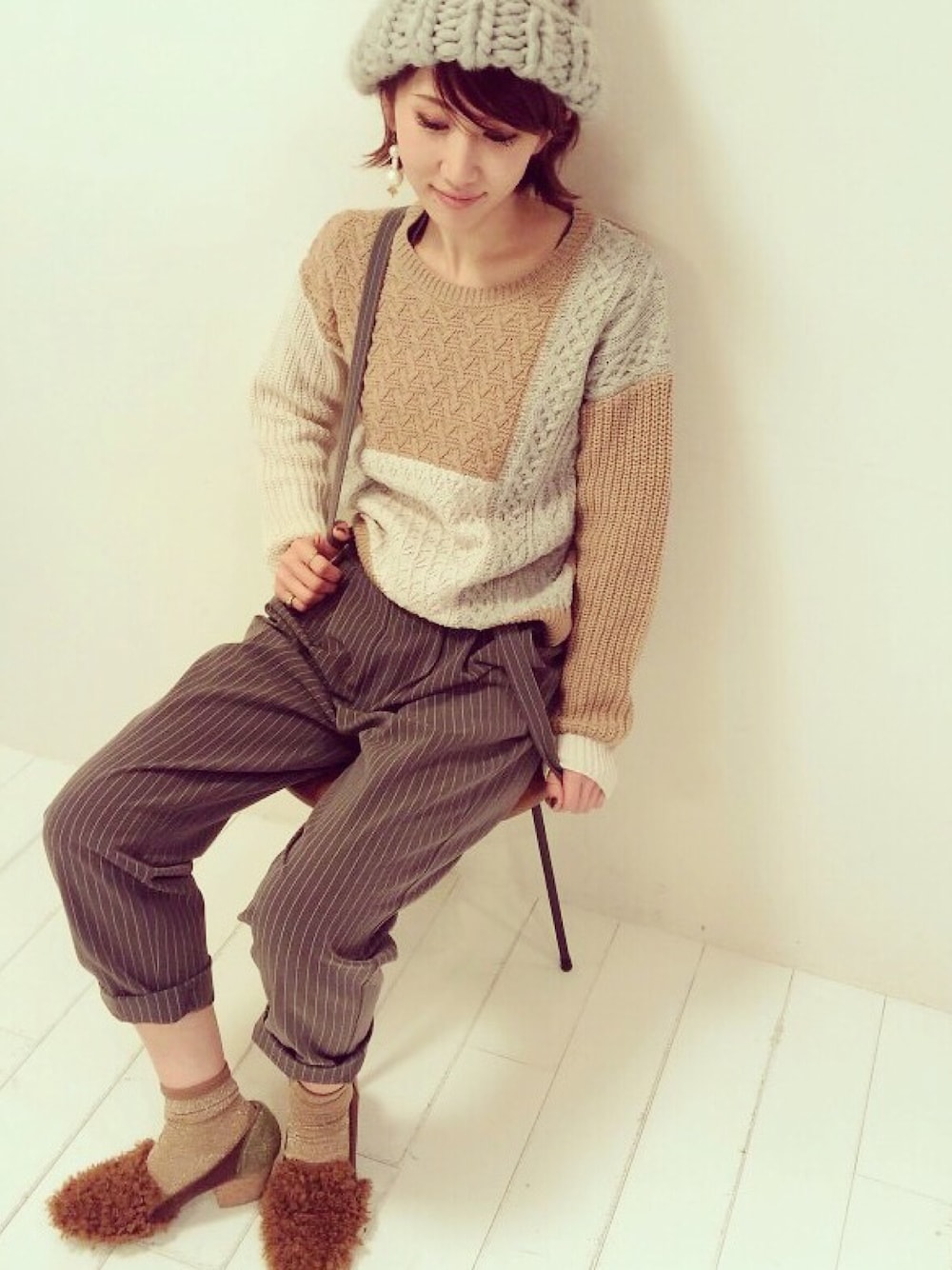 本社ショールームで新作撮影会☆ カラーブロックプルはカタログで 村田倫子ちゃんと阿部朱梨ちゃんが 色違い着用してくださってます 編み方とカラーが色々組み合わさった こだわりのめちゃくちゃ可愛い1枚♡ サスペンダー付きのパンツはnon-no掲載 こちらも大政絢ちゃんがカッコよく着こなして 下さってるのでこちらも要チェックです☆