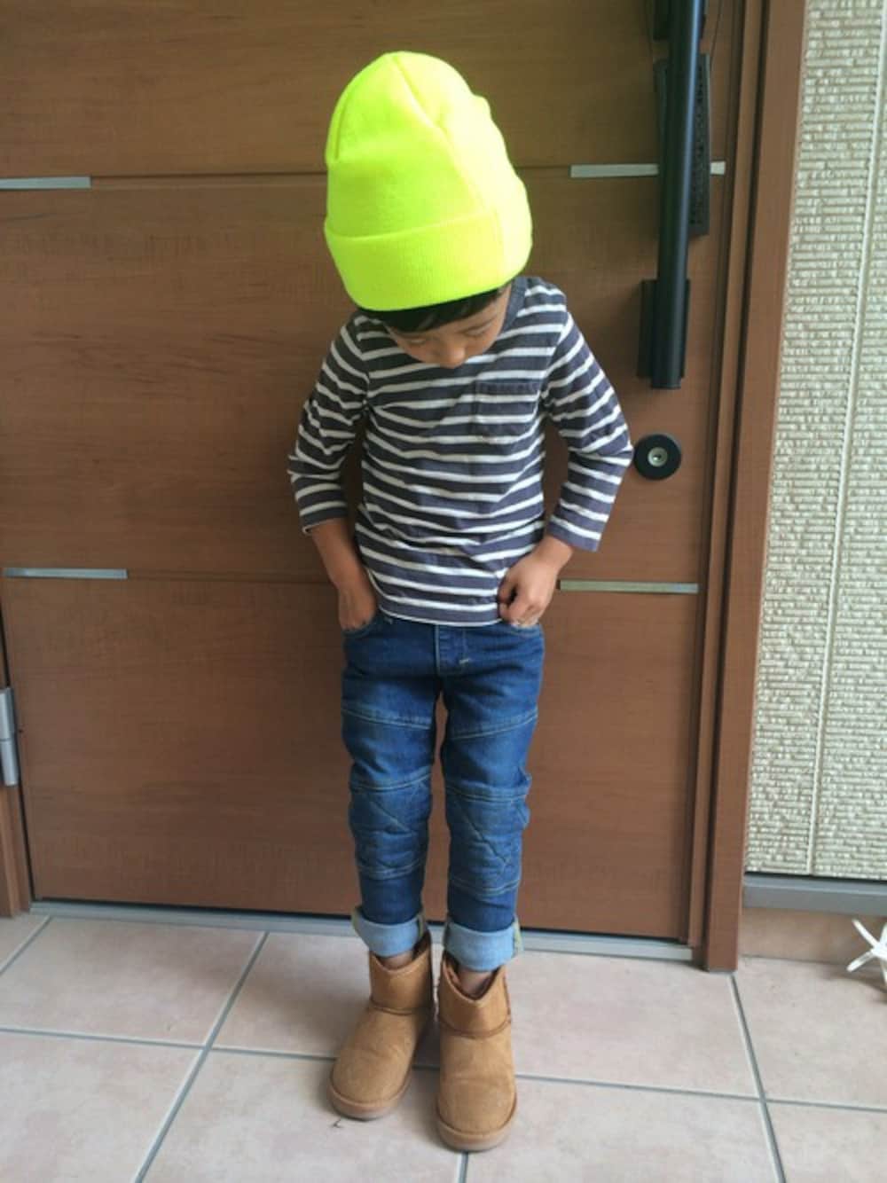 秋の公園スタイル!お気に入りのストライダーパンツ。ストレッチが効いて動きやすく、ウエストリブで履きやすい仕様です。ムートンブーツに、ポイントとなる蛍光カラーのニット帽を合わせました!