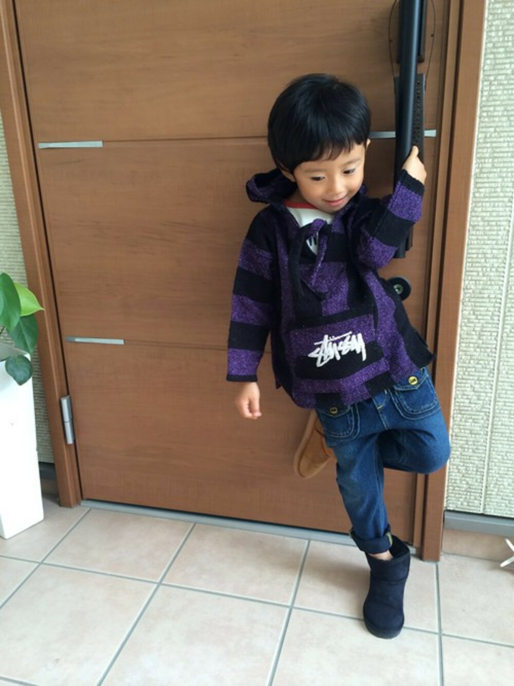 ブルー系のその他パンツを着用したキッズの秋コーディネートの1枚目の写真