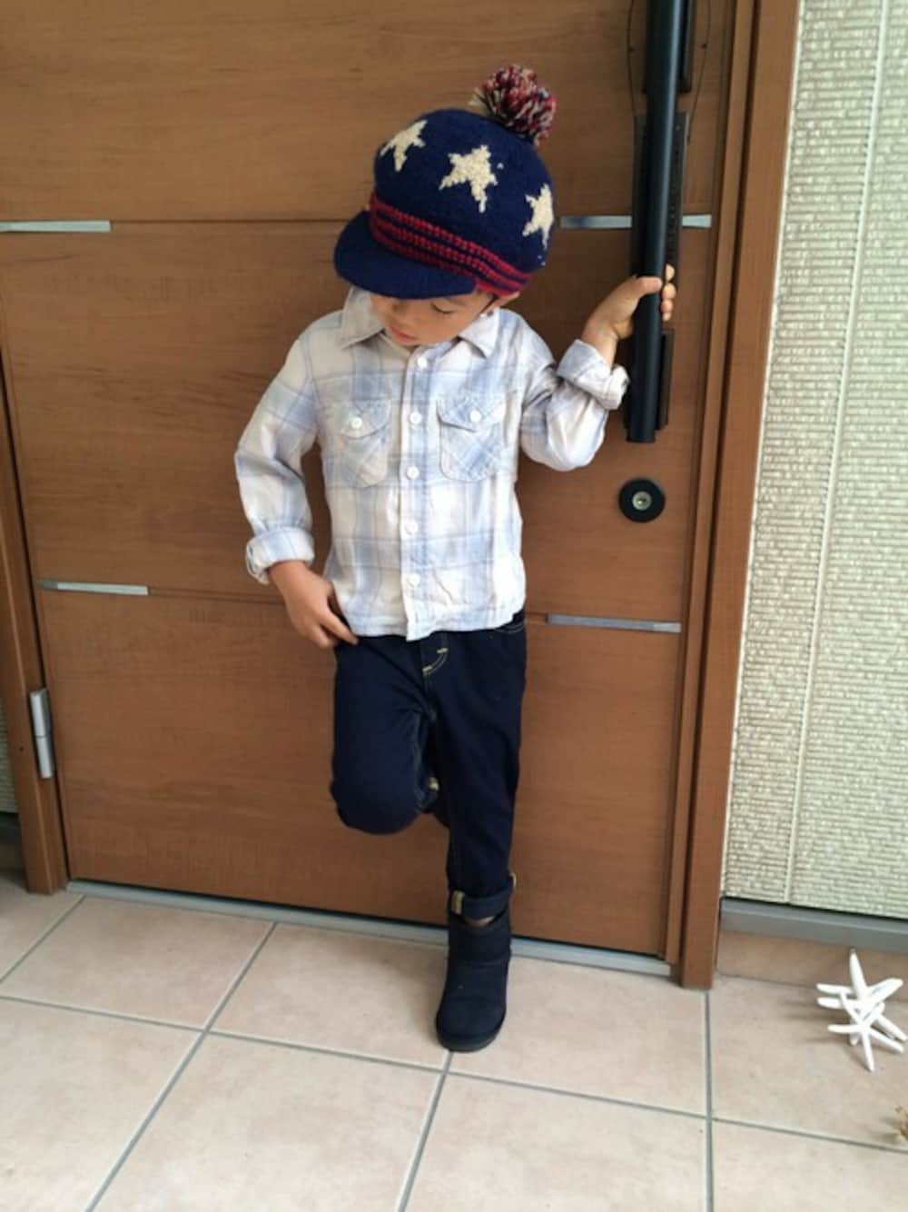 たーくさん遊ぶ日のお出かけスタイルです。飛んだり跳ねたり、たーくさん動く日はニットデニムがぴったりです。今年大注目のワンウォッシュに明るめカラーのチェックシャツを合わせました。