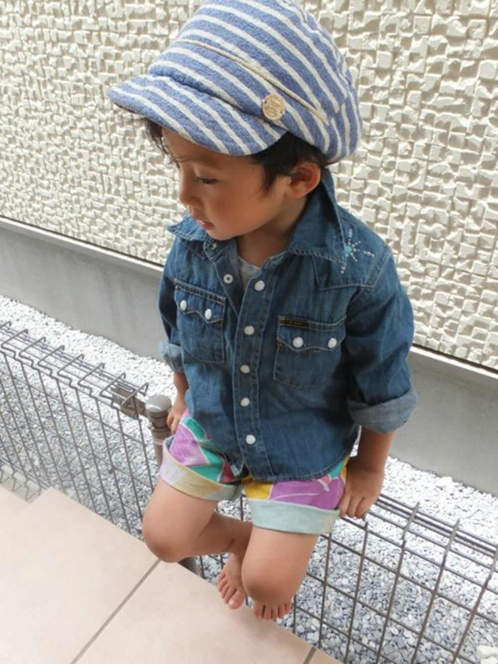 ZOZO限定のデニムシャツ。さらっと羽織り感覚で着こなしています。タイトな作りになっています。大人顔負けに、肩に掛けたり、ウエストマークに使ったり・・長く使えるデニムシャツです。プールや海あがりにも、さらっと着させようと思います!