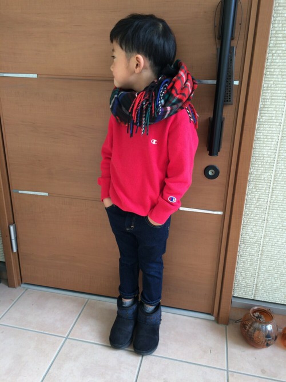 リバースリーブのスウェットに合わせたのは、シンプルなニットデニム。Leeらしいステッチワークがオシャレ。ワンロールアップしてボアブーツに合わせるのがポイントです。マフラーをぐるぐる巻きにして、初詣に行ってきます!!