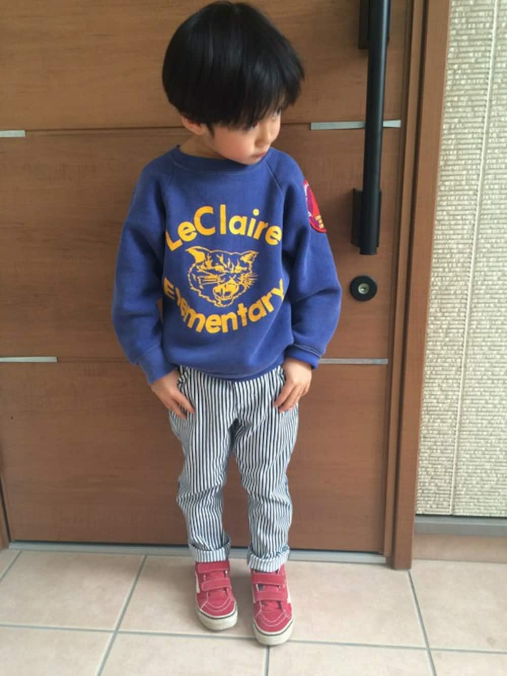 これから公園へ!ヒッコリー柄のニットパンツは動きやすくお気に入り♡赤のスニーカーがポイントです!