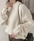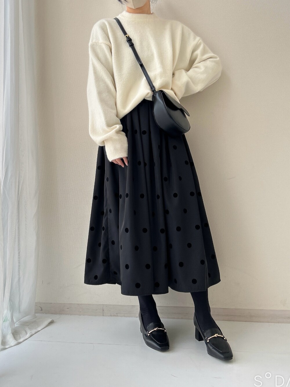 ゆるっとしたシャギーニットと上品な印象のフロッキードットのスカートが相性抜群♡ 甘くなりすぎない女性らしいシルエット。 ヒールのあるローファーとの相性も◎