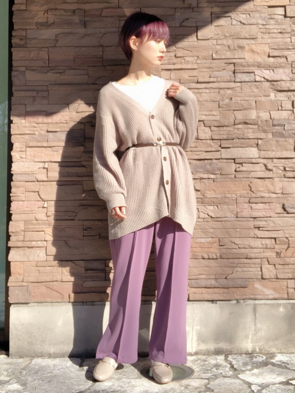 2月に入り、春の新作たくさん入荷してきたのでまた投稿再開していきます〜!! 本日の着用コーデ。ベージュ×パープル このパンツすごくかわいい!!今の髪色と一緒🍇♡ ストレッチきいてて履きやすく、シルエットも綺麗! センタープレスのパンツって洗濯したら折り目取れちゃうこととかあるのですが、これは折り目しっかり縫い付けてあるので安心✨ カーディガンもプチプラで丈も選べるので使いやすいですよ!