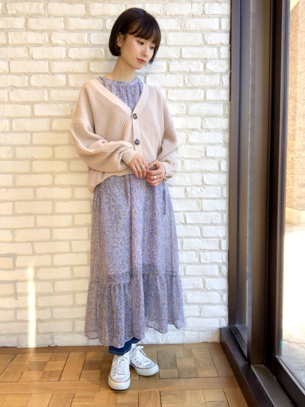 WEB限定のカーディガンはルーズ感が華奢見え♡ ライトベージュなので淡いカラーと合わせれば一気に春っぽい! にしても久々にこんなガーリーなコーデ着た😳 ワンピースとの合わせは甘過ぎないようにスニーカーで引き算👟