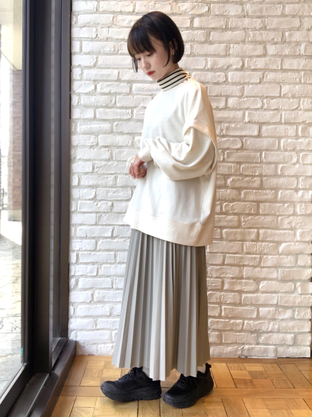 全体的にルーズシルエットな店頭コーデ。 ゆるだぼのプルオーバーは袖の切り替えが今っぽい🤍 クールめなシューズともマッチするフェイクレザーのスカートはなじみやすいグレーベージュだから、きれいめもフェミニンもいけちゃう万能さん🤢🤍 レザー初心者でも挑戦しやすいアイテムかも☝️ 素材もかなりストレッチきいてて柔らかい! 最近よく着てるタートルインナーはまだまだ寒い東北では必需品。 首元からボーダーチラ見せするだけでかわいいっ!です🦓🤍