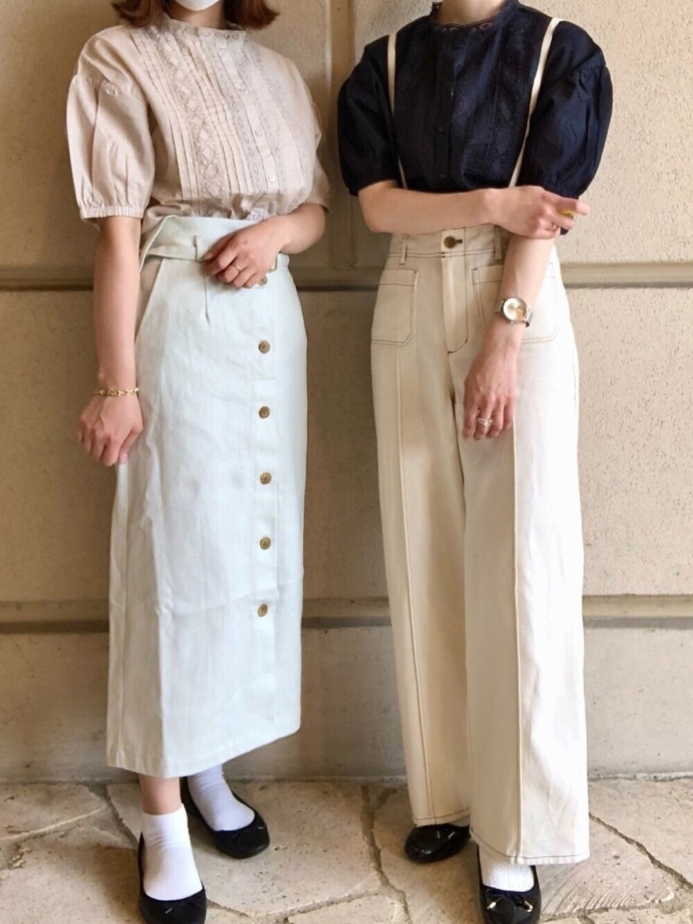シミラーコーデ👭 繊細なレースが上品なピンタックブラウス。 二の腕をふんわりカバーできる袖丈なのが嬉しい! 合わせる色とボトムス次第で甘くなりすぎず着れます。 ボトムスはサスペンダーが取り外し可能◎ どちらもラインを拾いぎずスッと綺麗に見せてくれるシルエットです。