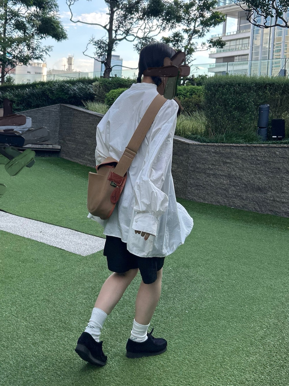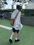 トップスとパンツがシンプルなぶん、バッグと靴は大好きなものを! 靴下にロゴが入ってるのも可愛いポイント!