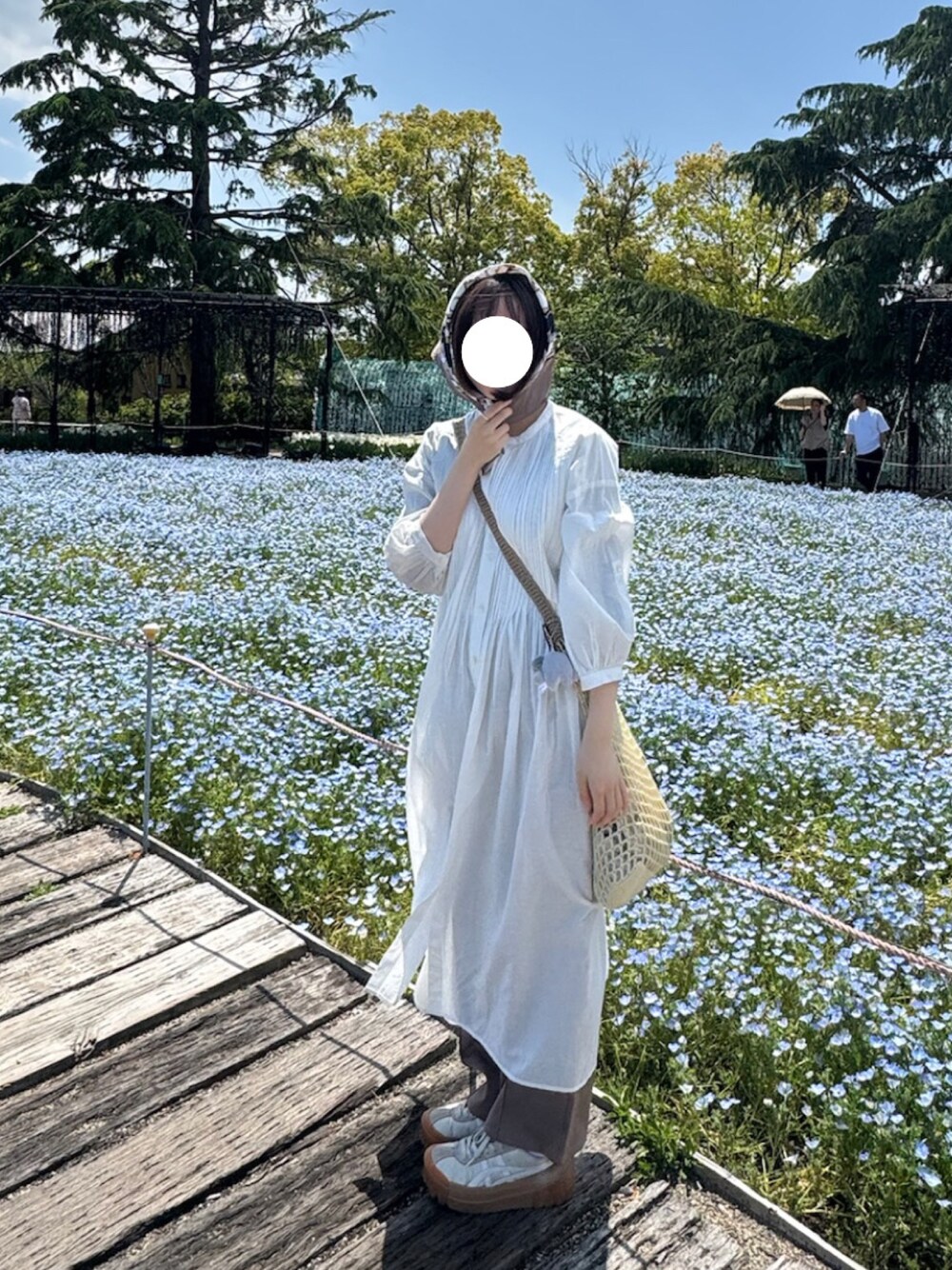 お久しぶりです☺︎ 白のワンピースを着れる機会って あんまりない気がして。 ネモフィラと1枚撮りました📷