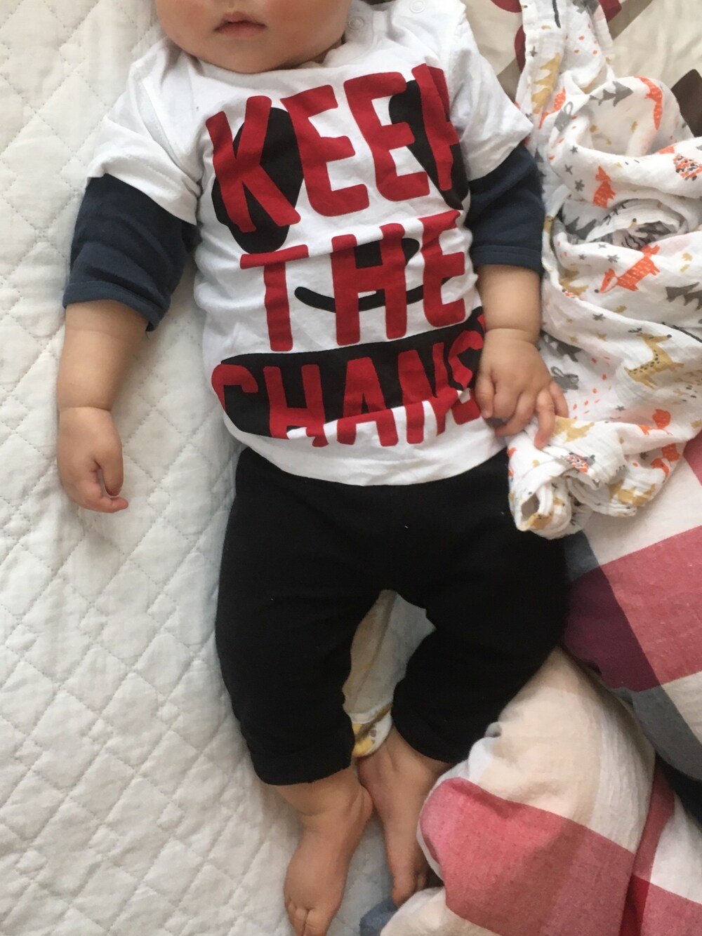 ホワイト系のTシャツ/カットソー、ブラック系のパンツを着用したキッズの春コーディネートの1枚目の写真