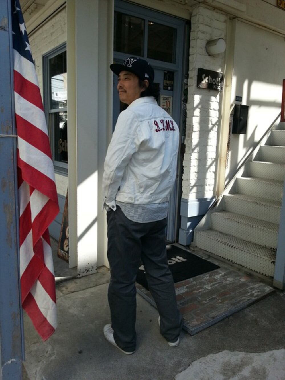 hamadaのデニムジャケット「Schott/ショット/SELVAGE WHITE DENIM JACKET/セルヴィッジ ホワイトデニム ジャケット」を使ったコーディネート