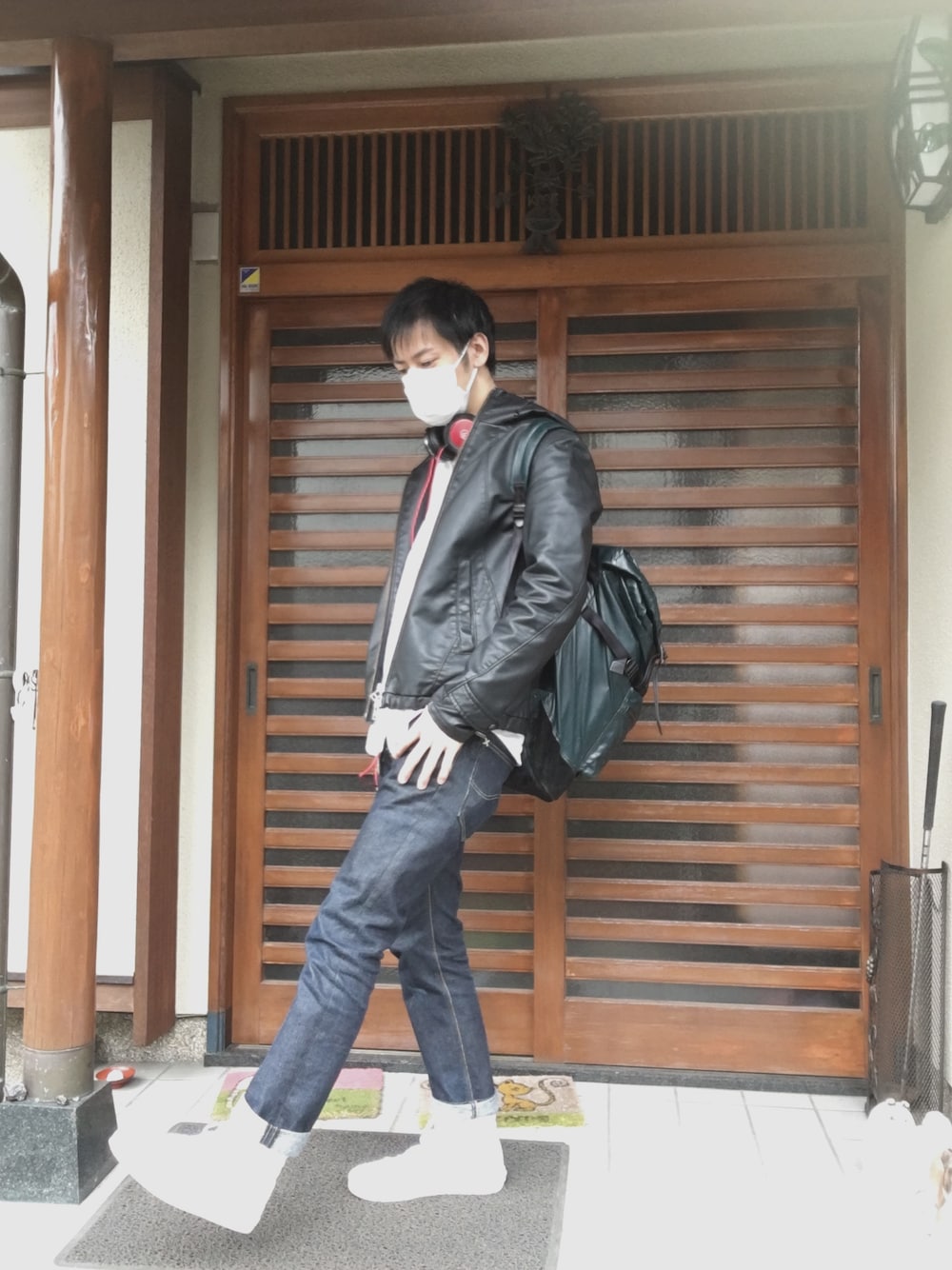 パーカー付きのライダースに、白シャツ、白スニーカー、にジーンズ おとなし目のコーディネートに見えて、真っ赤なヘッドホンをかけてみる(´⊙ω⊙`) よかったらフォロー、コメントお願いします(´⊙ω⊙`)