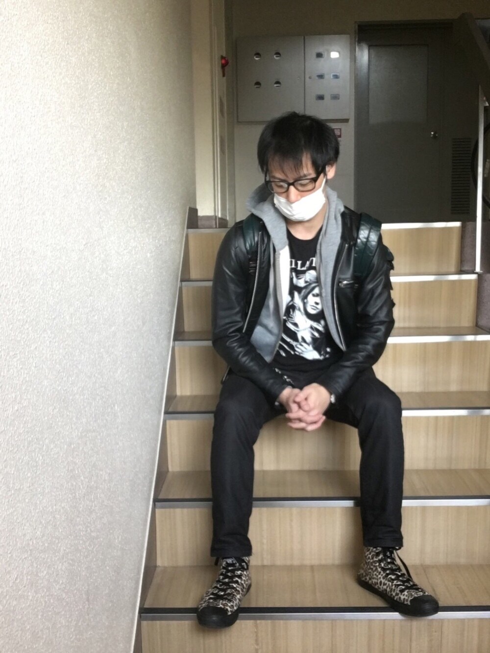 革ジャン黒コーデに、アクセントに白の時計、 ヒョウ柄のスニーカー オシャレかは分からないけど今日はこんな感じでしたー^_^