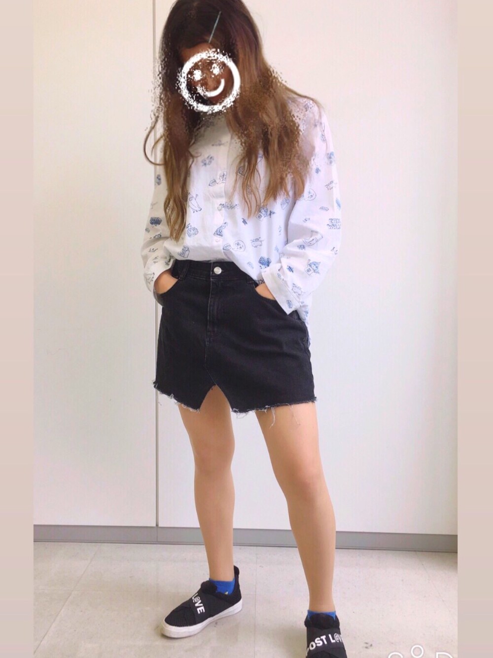 ハマデWEAR再始動!第1号さんは モデル:ありんこちゃんです🐜🐜 テーマ:スクールスタイル シャツはメンズサイズで柄で遊び心をプラス!スカートは黒のデニム生地でシャツとのギャップがかわいいスクールスタイルです🙋♂️ @ヒサ🚂