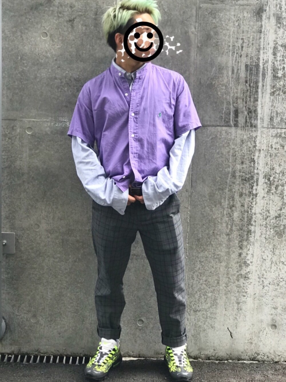 モデル:ひさ🚂 テーマ:ダブルシャツ👔👔 テーマの通り2種類のシャツを使ったコーデです! ビックシルエットの青のワイシャツはタックインをして上から紫の半袖ワイシャツを着てきっちりとまとめてみました☺︎ 全体の色を寒色でまとめて統一感を出してみました 髪色との相性はGOODです👍