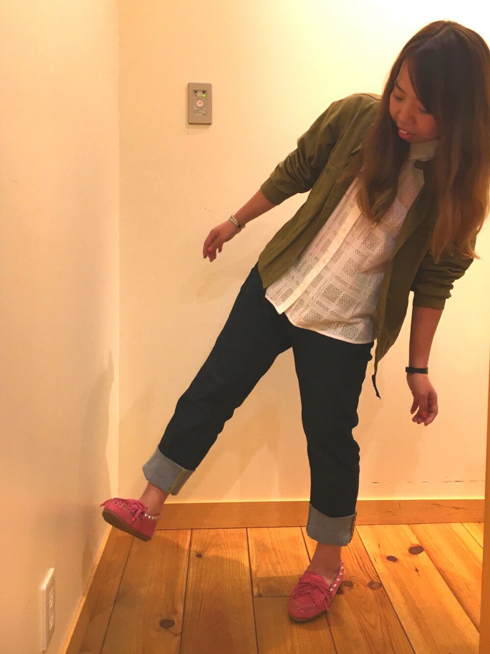 コンニチハ☺︎ レベッカミンコフコラボ💫Hot pink 定番モカシンの濃い目ピンクより少し褪せた色味がツボです☺️❤️カーキと相性のいいピンクは秋の雰囲気にぴったりですね✌︎