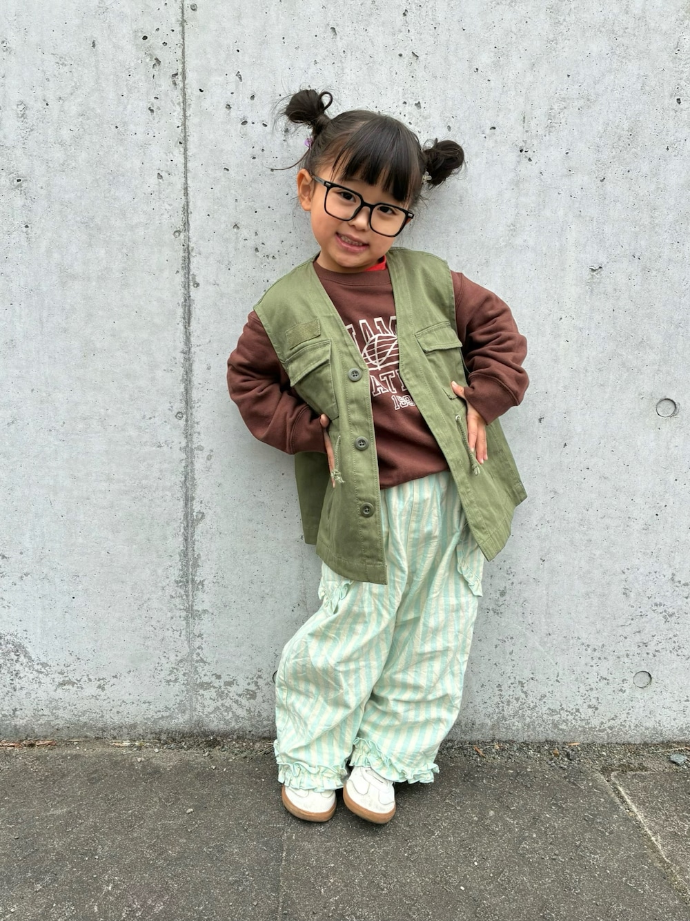 𝕝𝕟𝕤𝕥𝕒𝕘𝕣𝕒𝕞 ‣‣@haru.haru.haru.family スウェットとベストでカジュアルに! パンツはハートポケットにフリルでちょこっとガーリー🥺
