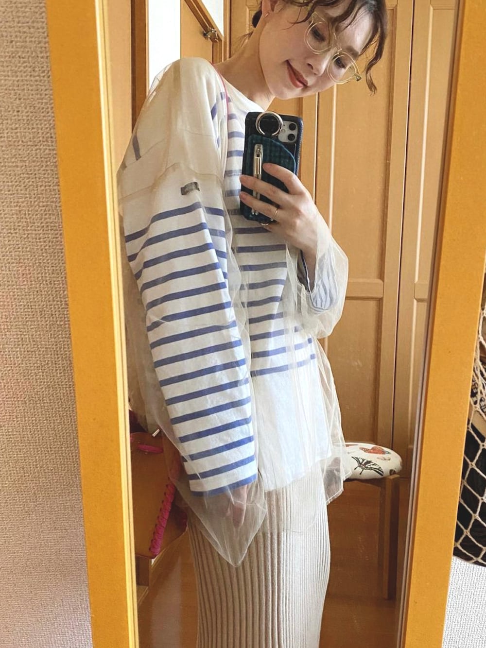すけすけトップスでいつものコーデに変化をだしました✨ クリアメガネで旬なスタイルに😊