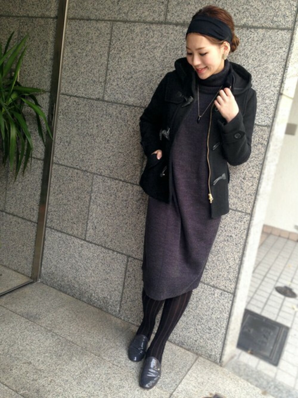ルーズなニットワンピースには、ショートダッフルコートを合わせてスッキリと。