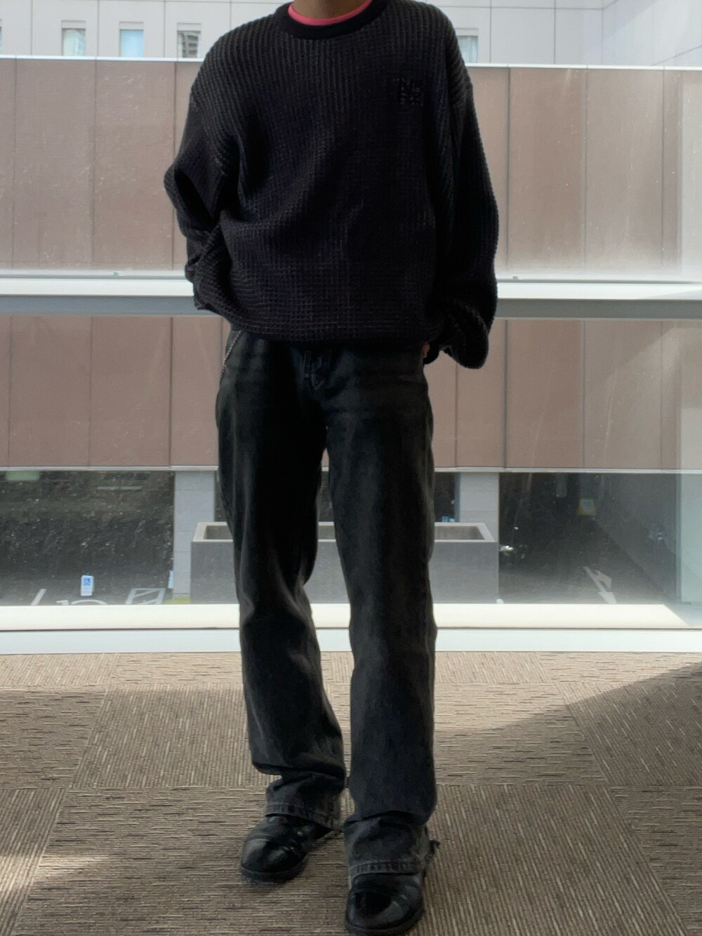 hamburgerboy(MONO-MART)のニット/セーター「【Alfred Alex】ワンポイントロゴ刺繍オーバーサイズポップコーンニット」を使ったコーディネート