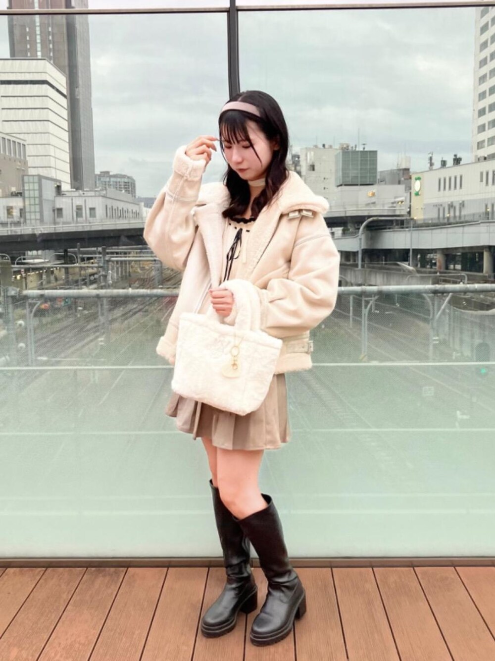 中のニットは真ん中にリボンがついてるのでアウターを重ねても可愛い♡ボアブルゾンはとっても軽くて質感柔らかいので着やすいです✨