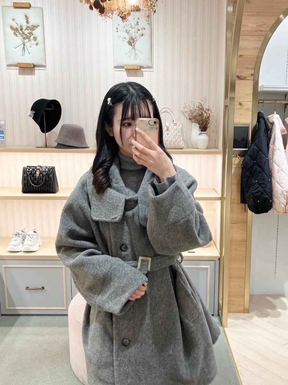 158cm Mサイズ着用(Mサイズのみ) 新作のコート着てみました🩶 前を閉じるのと開けてゆるっと着るのではかなり違う雰囲気で着られます🎶