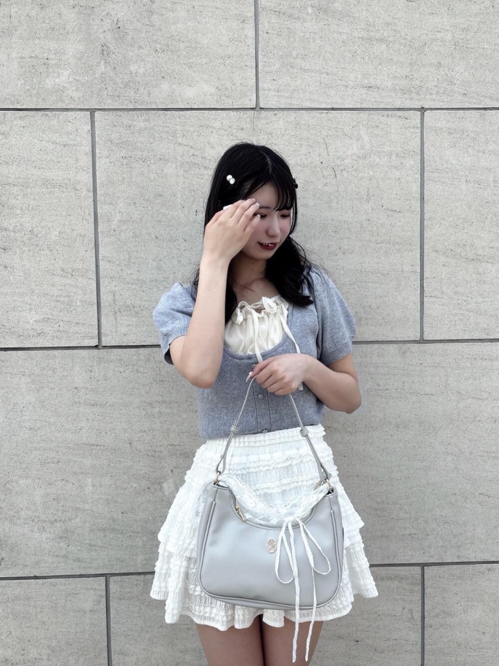 フロントのギャザーとリボンが可愛いニットにカットレースのスカートを合わせたトレンドガーリーコーデ💖 ミュールを合わせて抜け感を出しました❤︎