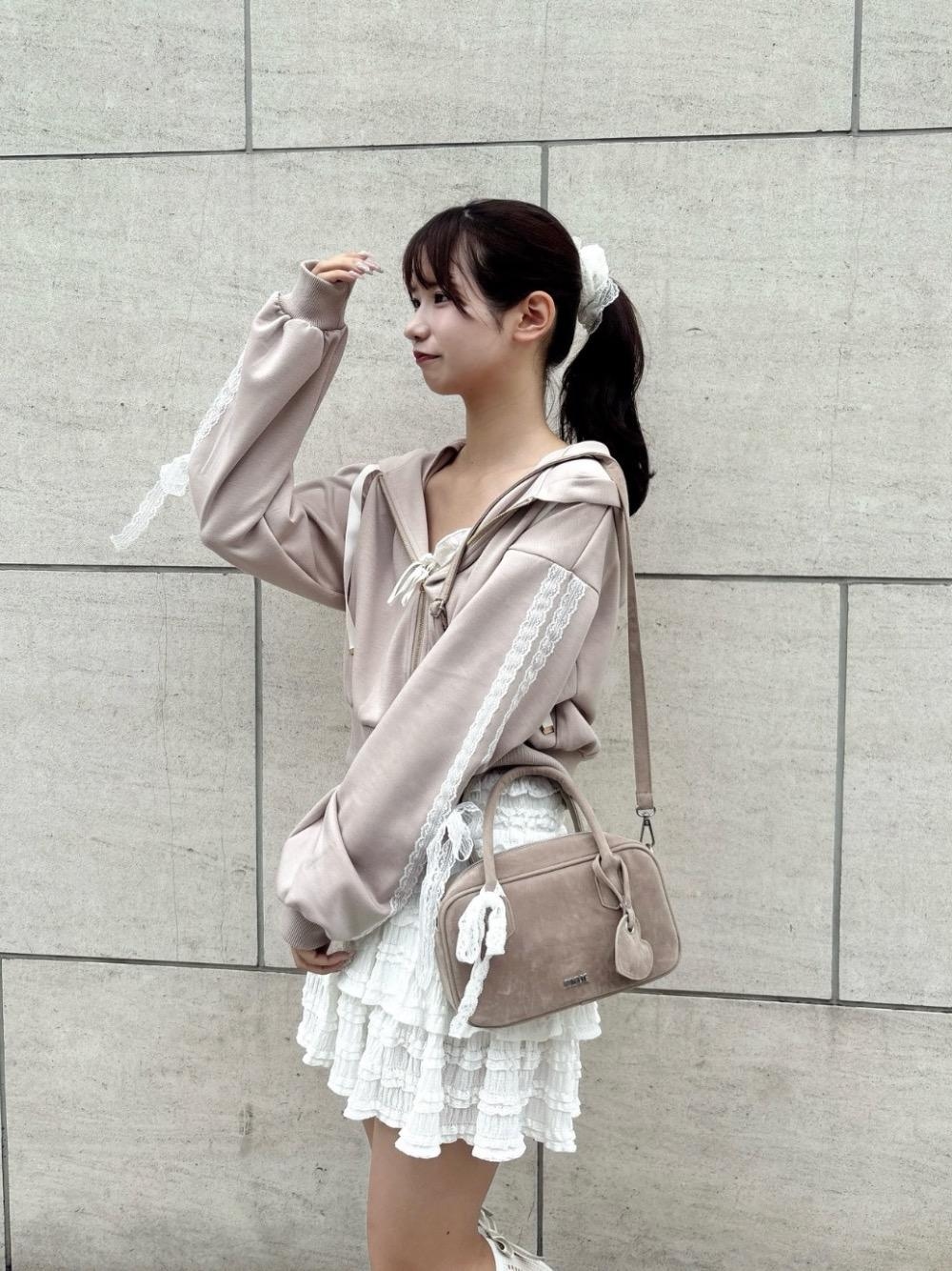 レースのリボンが可愛いパーカーにレースのミニスカートを合わせたトレンドガーリーなコーデ💖肌触りがとってもいいので通勤の時などの羽織りにもおすすめです🫶🏻 スカートは中がパンツになってるので1枚で履きやすいです◎